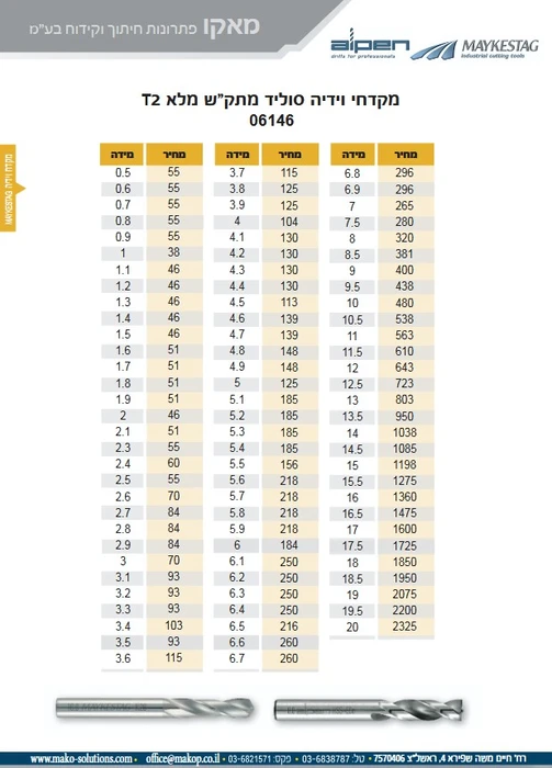 מקדח וידיה סוליד מתק"ש מלא T2