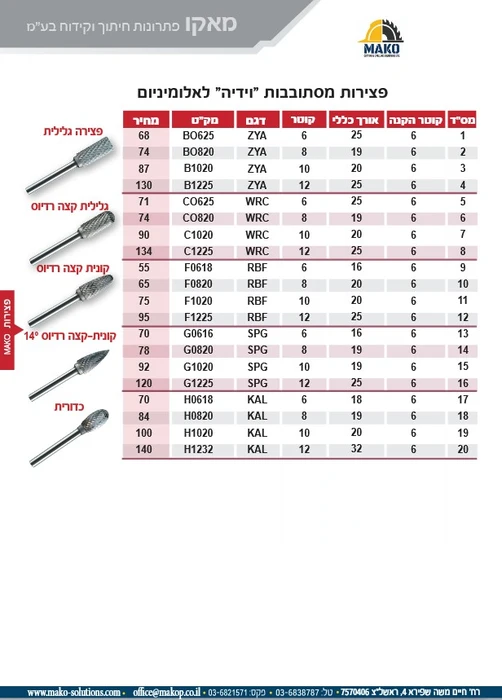 פצירה מסתובבת וידיה לאלומיניום : גלילית , גלילית קצה רדיוס , קונית קצה רדיוס , קונית 14 מעלות , כדורית