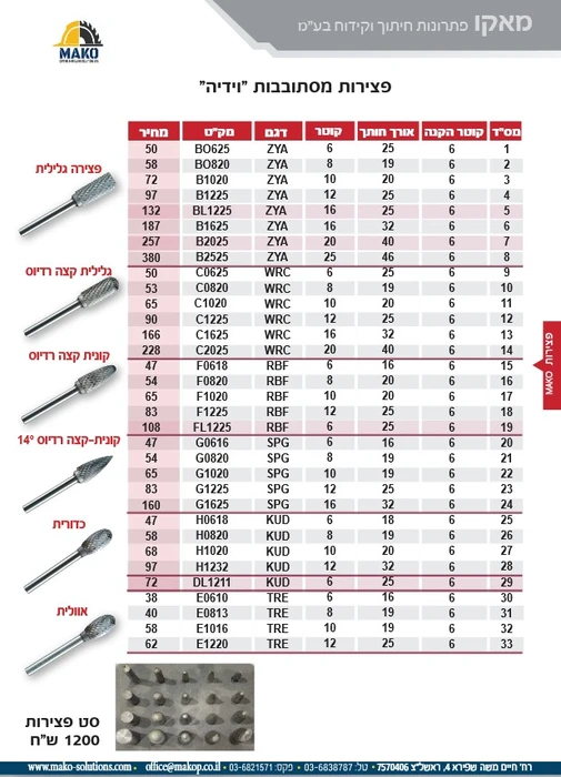 פצירות מסתובבות וידיה , פצירה גלילית , פצירה גלילית קצה רדיוס , פצירה קונית קצה רדיוס , קונית 14 מעלות קנה רדיוס , כדורית , פצירה לאלומיניום