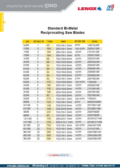 משוריות LENOX , STANDARD BI-METAL , CRABOX T-SHANK , BI MEATAL SHANK